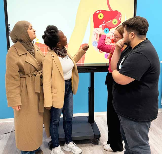 Die Teilnehmenden trainieren typische Situationen aus dem Pflegealltag – von Übergaben und Gesprächen mit Patient:innen bis hin zur Dokumentation. Dabei wird praxisnah mit pflegespezifischem Fachwortschatz gearbeitet, um Sprachkompetenz und Ausdruckssicherheit gezielt zu fördern.